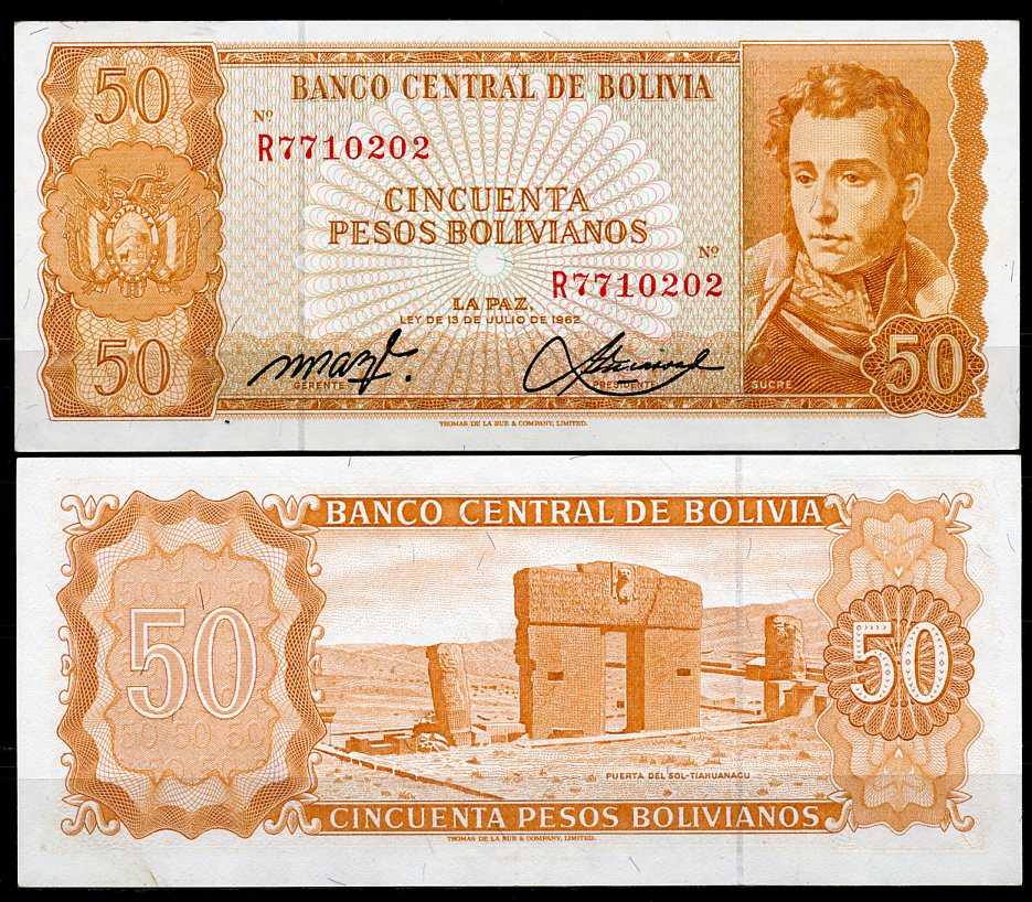 Боливия 50 песо боливиано 1962 серия R7, Антонио Хосе Сукре, TDLR Pick 162 a (20) бумага UNC (пресс) 7219-13-3-1