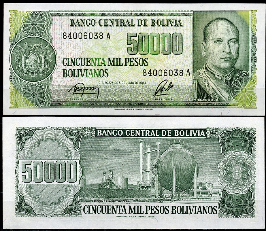 Боливия 50000 боливиано 1984 Гуальберто Вильярроэль, нефтеперерабатывающий завод Pick 170 a (2) бумага UNC (пресс) 7202-32-2
