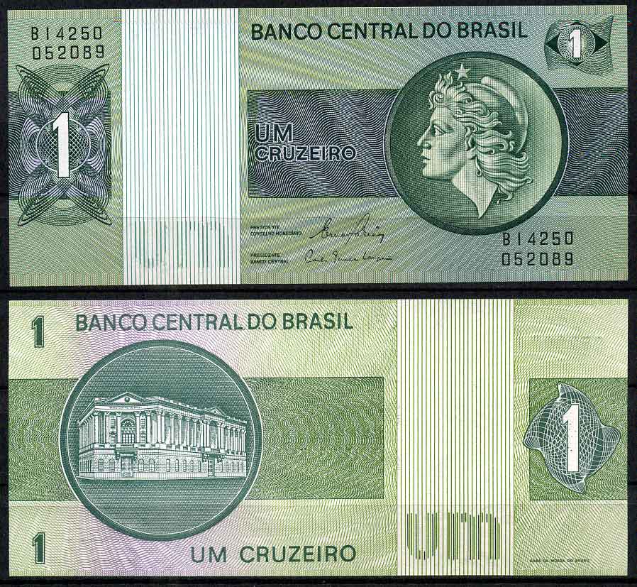 Бразилия 1 крузейро 1980 серия В 14250, подпись 20, голова свободы, здание Центрального банка Pick 191A c бумага UNC (пресс) 447-13-1