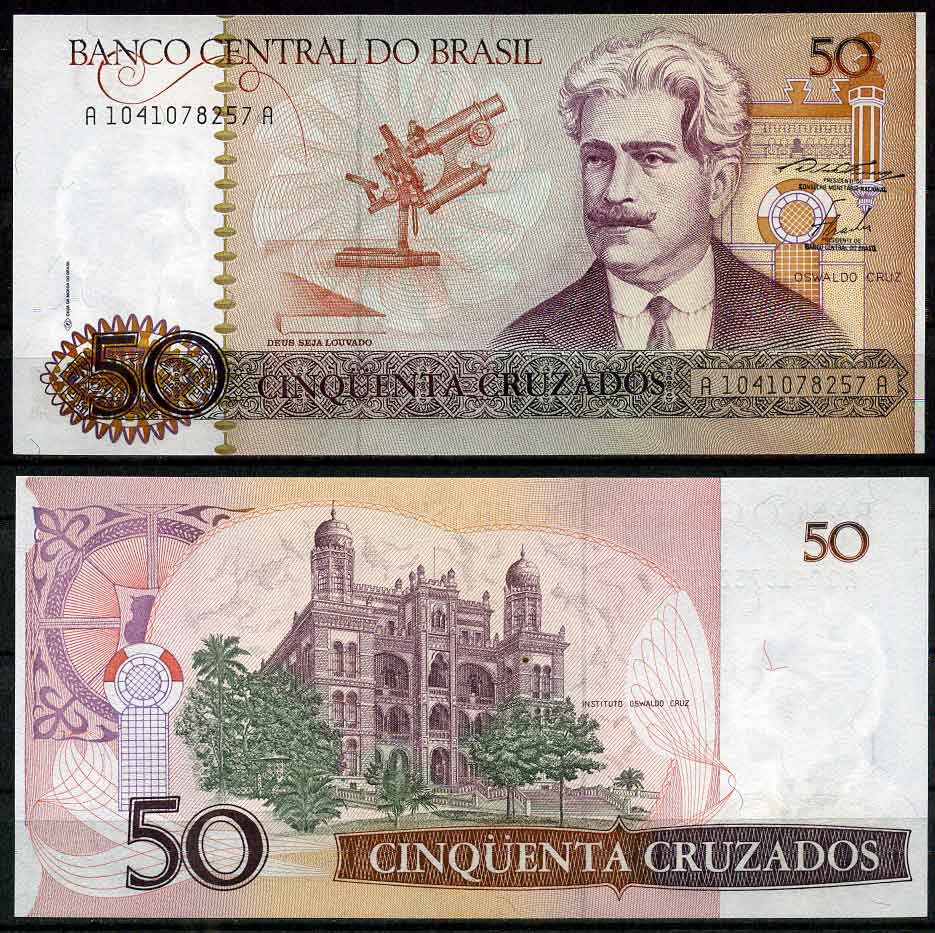 Бразилия 50 крузейро 1986 подпись 23, серия А 1041, ОСВАЛЬДО КРУЗ Pick 210 a бумага UNC (пресс) 447-16-1