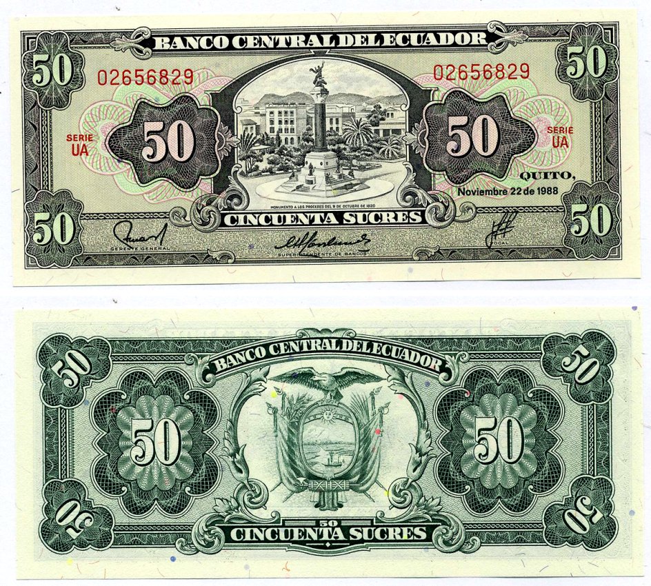Эквадор 50 сукре 1988 22 ноября 1988, серия UA, первый тип подписи Pick 122 а бумага UNC (пресс) 449-41-2