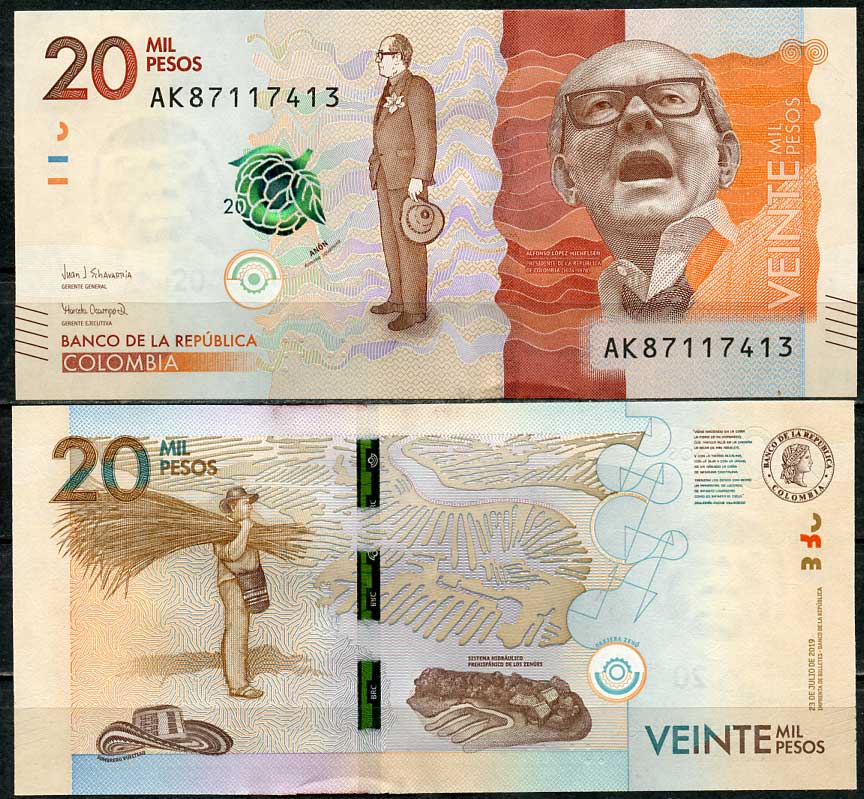 Колумбия 20000 песо 2019 Альфонсо Лопес Микельсен, мужчина с тростником Pick 461 e бумага UNC (пресс) 447-70-1-3