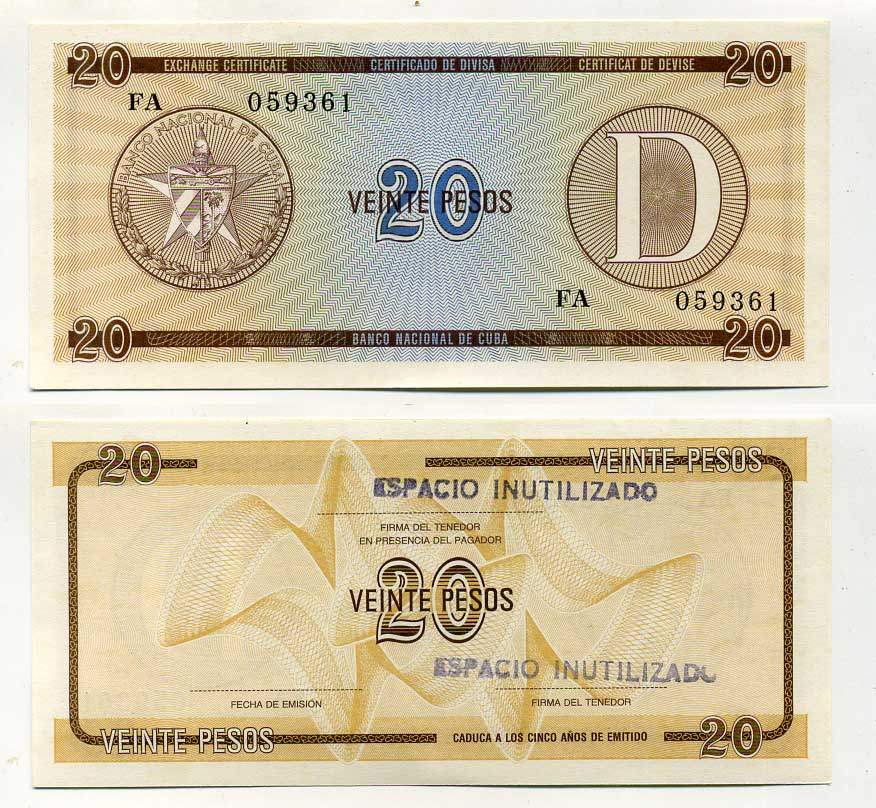 Куба, валютный сертификат 20 песо ND серия D, желтая, второй выпуск Pick FX 36 бумага UNC (пресс) 7487-60-1-2