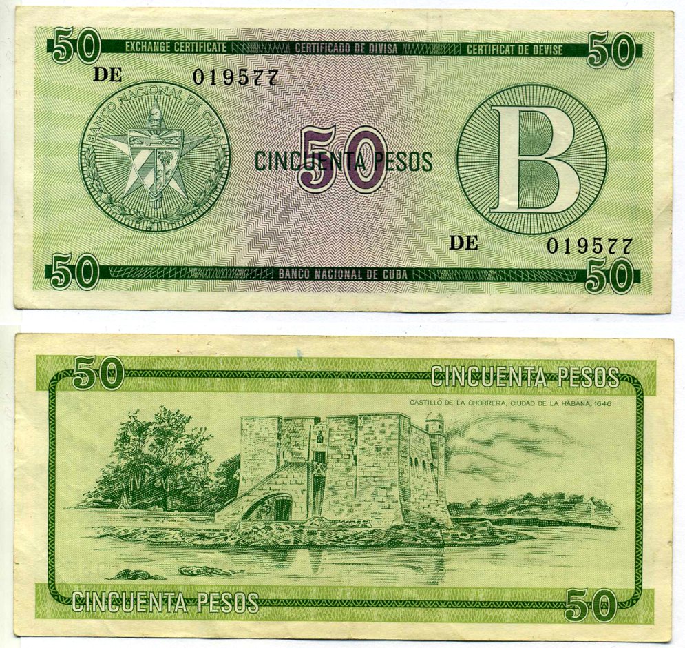 Куба, валютный сертификат 50 песо ND (1985) серия B, зеленая Pick FX10 бумага 000-00-00