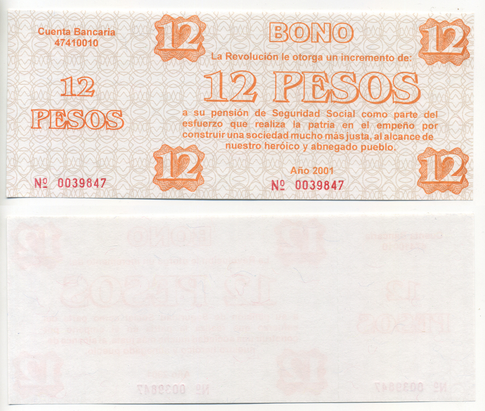 Куба талон на 12 песо 2001 увеличение фонда социальной защиты для пенсионеров и ветеранов революции, с корешком бумага UNC (пресс) 00-00
