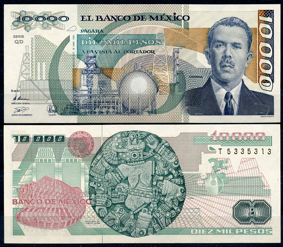Мексика 10000 песо 1991 президент Мексики Ласаро Карденас, серия QD Pick 90 d бумага UNC (пресс) 7200-5-3