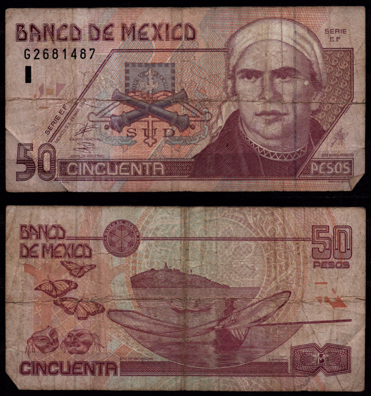 Мексика 50 песо 2002 Море́лос Хосе Мария, штат Мичоакан, бабочки Pick 117 b(1) бумага 8604-22-2-1
