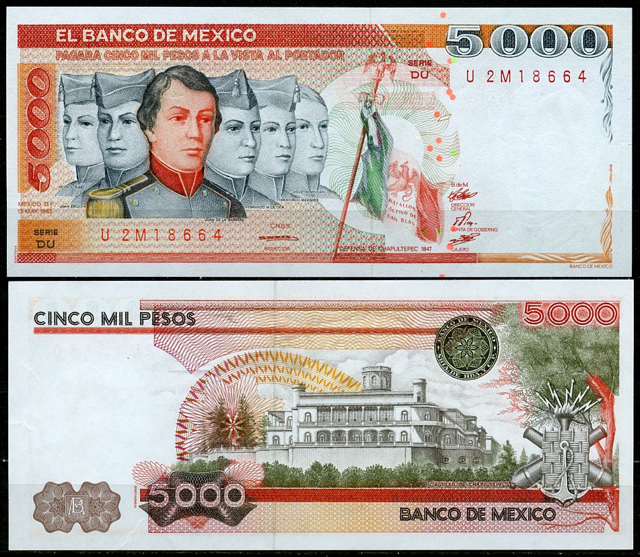 Мексика 5000 песо 1983 кадеты герои, Чапультепекский дворец, 13 мая 1983, серия DU Pick 83 a бумага UNC (пресс) 451-432-1