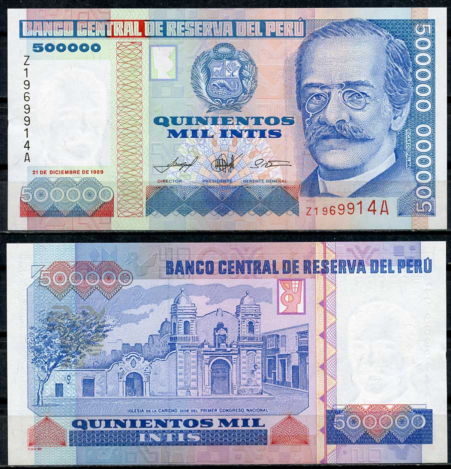 Перу 500000 инти 1989 Рикардо Пальма, церковь Каридад, серия Z, замещенная Pick 147 бумага UNC (пресс) 447-115-2