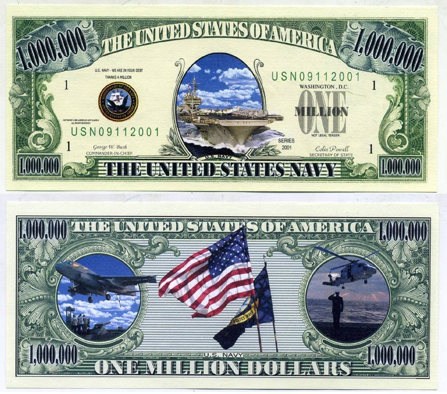 США 1000000 долларов 2001 сувенирная банкнота, серия армия США, ВМФ, Джон Буш, Коллин Пауэл бумага UNC (пресс) 7203-12-3