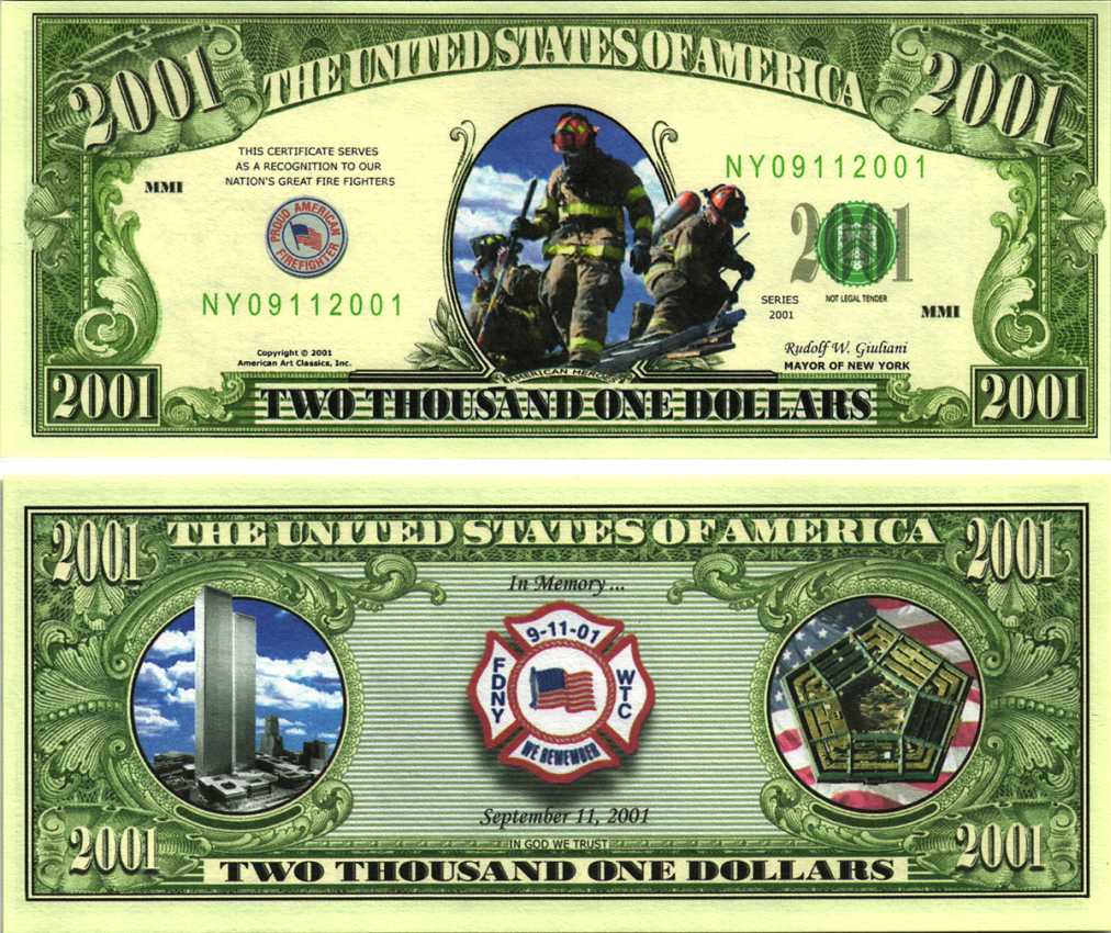 США 2001 ДОЛЛАР 2001 СУВЕНИРНАЯ БАНКНОТА, В ПАМЯТЬ ГЕРОЕВ СПАСАТЕЛЕЙ FDNY, ТРАГЕДИЯ 11 СЕНТЯБРЯ 2001 бумага UNC (ПРЕСС) 8588-69-2-1