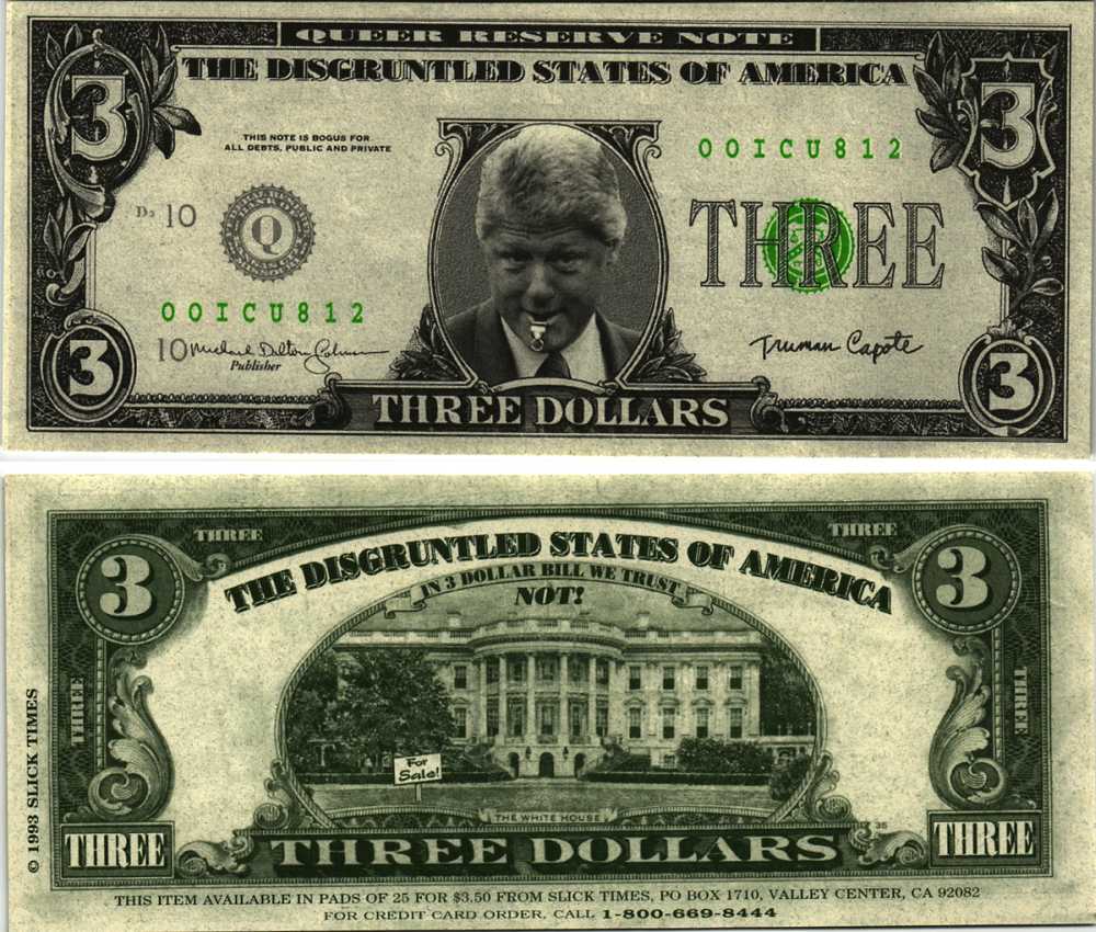 США 3 ДОЛЛАРА 1993 СУВЕНИРНАЯ БАНКНОТА, БИЛЛ КЛИНТОН СО СВИСТКОМ, НАДПИСЬ THE DISGRUNTLED STATES OF AMERICA бумага UNC (ПРЕСС) 7198-33-1-1