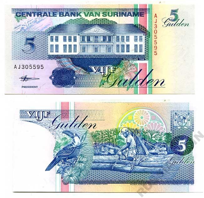 Суринам 5 гульденов 1998 здание Центрального банка, тукан Pick 136 b бумага UNC (пресс) 447-75-2