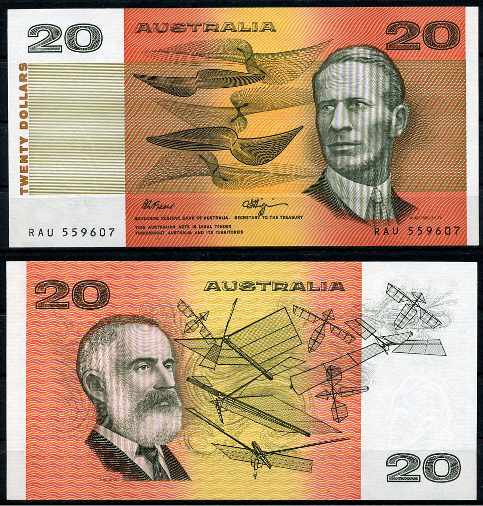 Австралия 20 долларов ND (1974-1994) сэр Чарльз Кингсфорд-Смит, Лоуренс Харгрейв, подпись Fraser - Higgins Pick 46 g бумага UNC (пресс) 451-391-2
