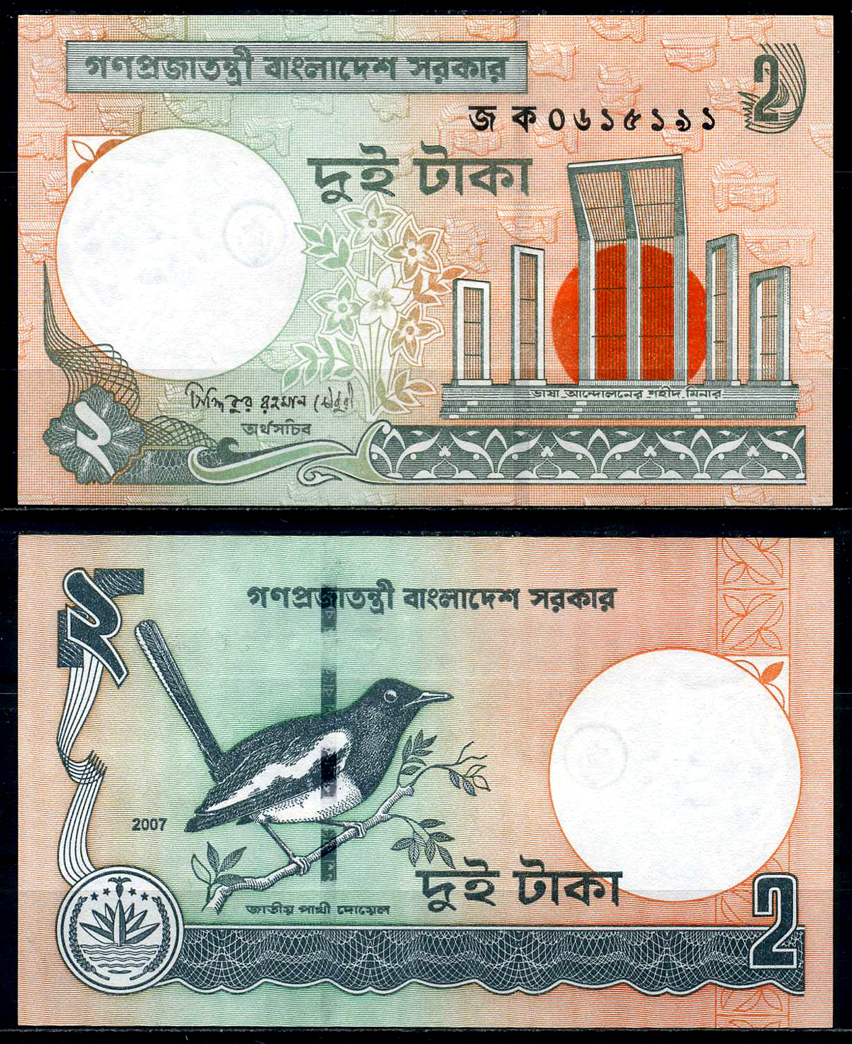 БАНГЛАДЕШ 2 ТАКА 2007 СЕГМЕНТНАЯ ЗАЩИТНАЯ ПОЛОСА Pick 6Cj бумага UNC (ПРЕСС) 446-5-1