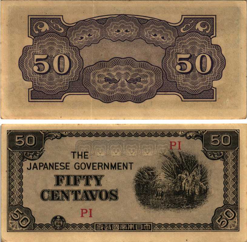 ФИЛИППИНЫ 50 СЕНТАВО 1942 ЯПОНСКАЯ ОККУПАЦИЯ, ВТОРАЯ МИРОВАЯ ВОЙНА, СЕРИЯ Р1 Pick 105a бумага 7487-61-1-2