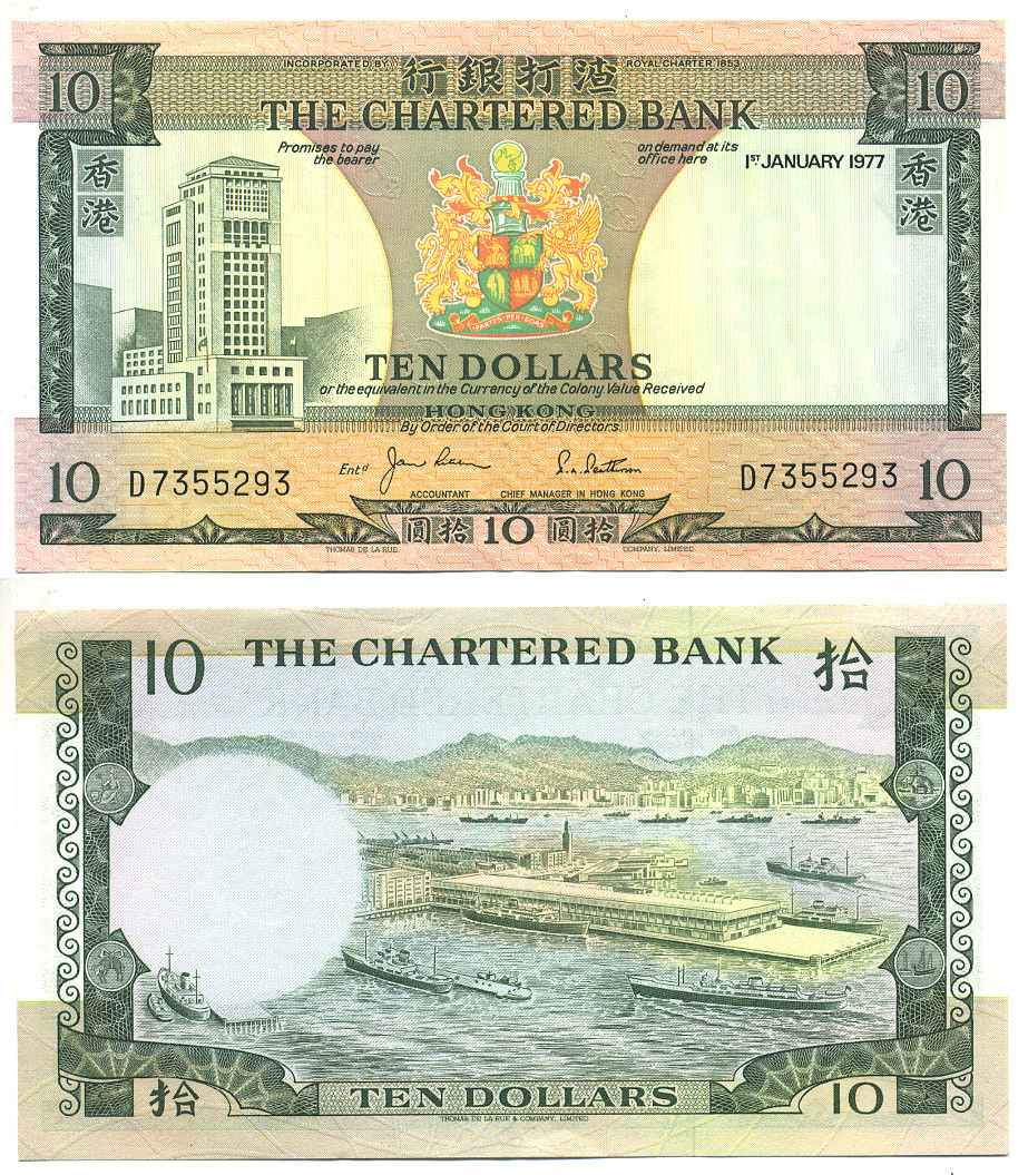 ГОНКОНГ 10 ДОЛЛАРОВ 1977 CHARTERED BANK Pick 74c бумага VF-XF 7548-98-2