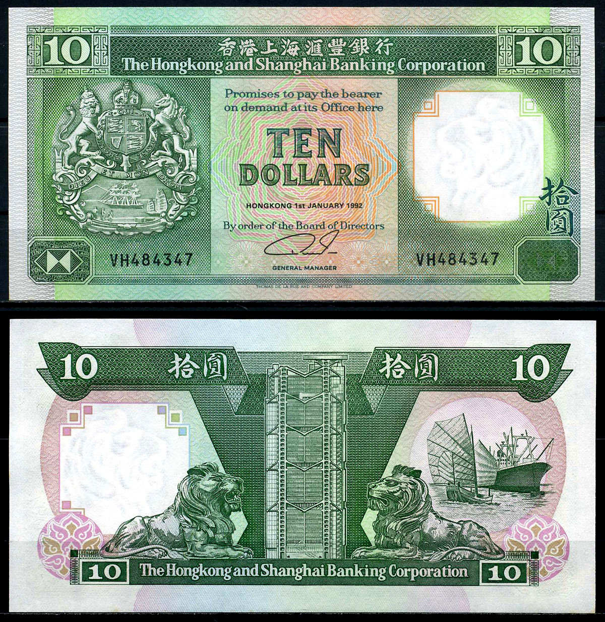 Гонконг 10 долларов 1992 Hong Kong & Shanghai Banking Corporation Pick 191c бумага UNC (пресс) 446-18-5-1