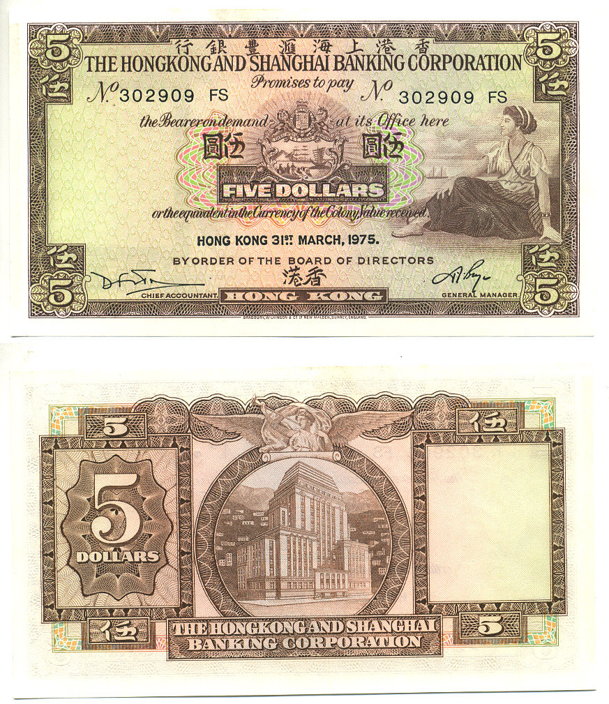 ГОНКОНГ 5 ДОЛЛАРОВ 1975 HONG KONG & SHANGHAI BANKING CORPORATION Pick 181f бумага aUNC 7548-92-1
