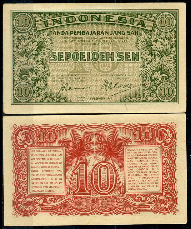 Индонезия 10 сенов 1947 Pick 31 a бумага aUNC 7200-9-1