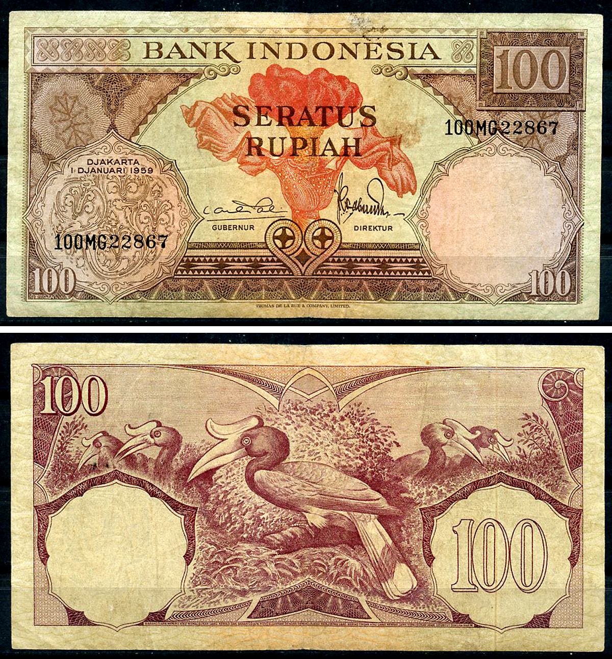 Индонезия 100 рупий 1959 гигантская раффлезия, малайский калао Pick 69 a бумага 444-2-3-2