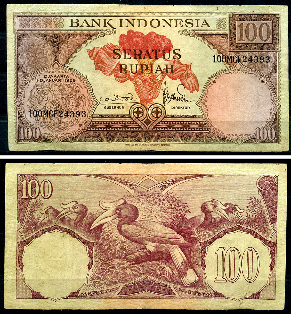 Индонезия 100 рупий 1959 гигантская раффлезия, малайский калао Pick 69 a бумага 444-26-2-1