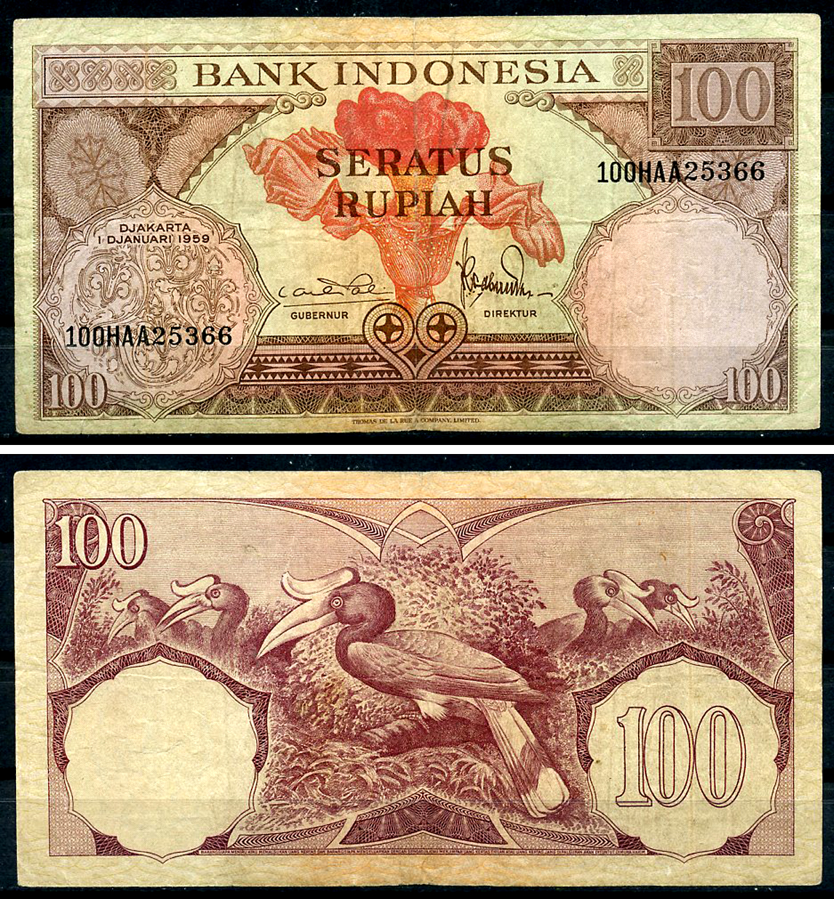 Индонезия 100 рупий 1959 гигантская раффлезия, малайский калао Pick 69 a бумага 444-7-2-2