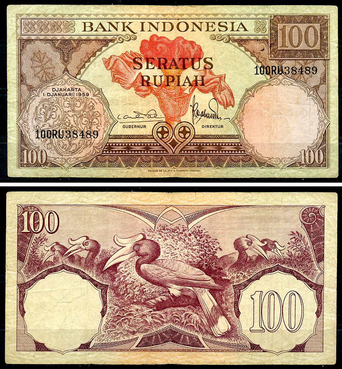 Индонезия 100 рупий 1959 гигантская раффлезия, малайский калао Pick 69 a бумага 444-8-2-1