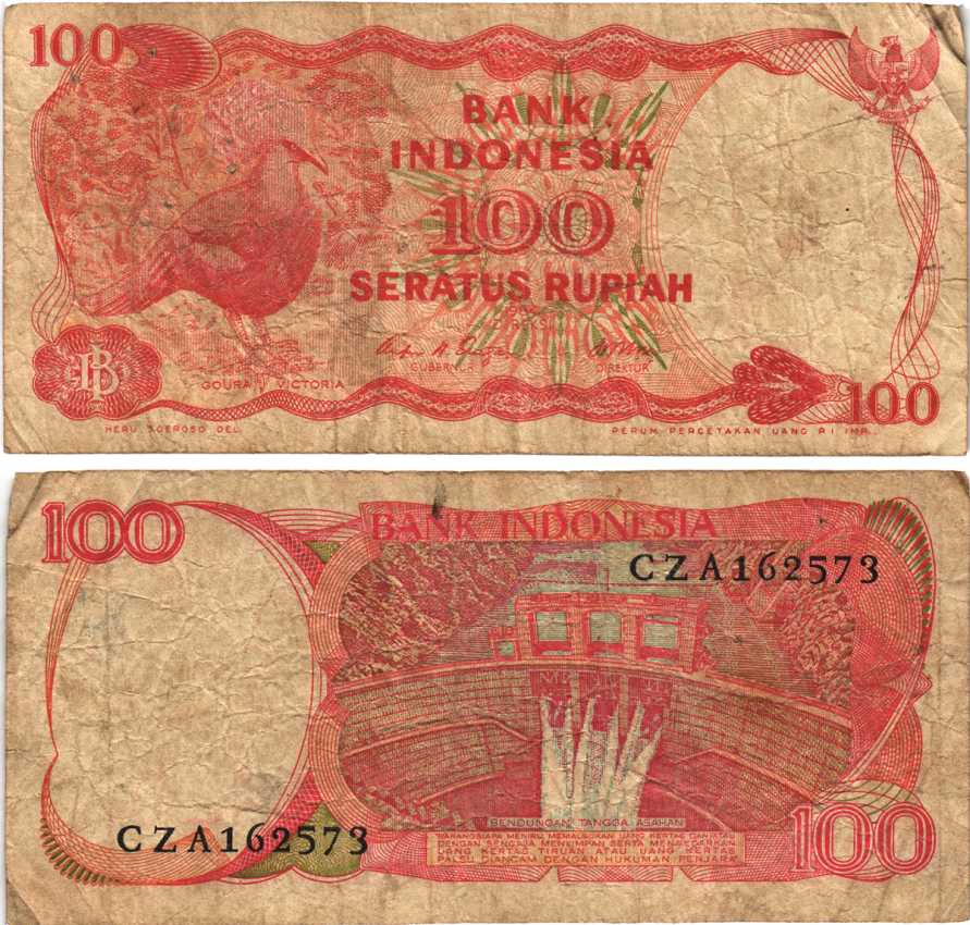 ИНДОНЕЗИЯ 100 РУПИЙ 1984 ВЕНЦЕНОСНЫЙ ГОЛУБЬ, ДАМБА АСАХАНА, ЛИТОГРАФИЯ Pick 122b бумага 6289-57-2-2