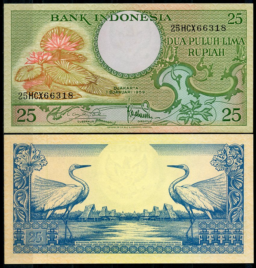 Индонезия 25 рупий 1959 водные лилии, большие белые цапли Pick 67 a бумага aUNC 7200-9-2