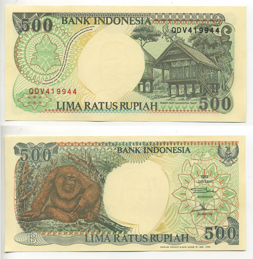 ИНДОНЕЗИЯ 500 РУПИЙ 1992/1998 ОРАНГУТАН, КАЛИМАНТАНСКИЙ ДОМ Pick 128g бумага UNC (ПРЕСС) 6294-46-3
