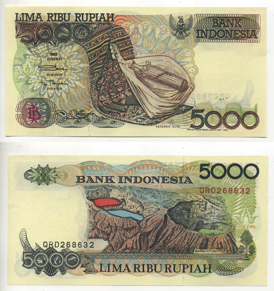 Индонезия 5000 рупий 1992/1999 Сасандо (музыкальный инструмент), гобелен (остров Роте), Келимуту (трехцветное озеро) Pick 130 h бумага UNC (пресс) 00-00