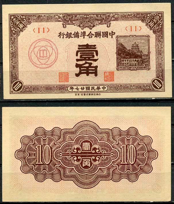 Китай 10 фень (фынь) 1938 Японская оккупация, федеральный резервный банк Pick J48 a бумага aUNC 8614-36-1-1
