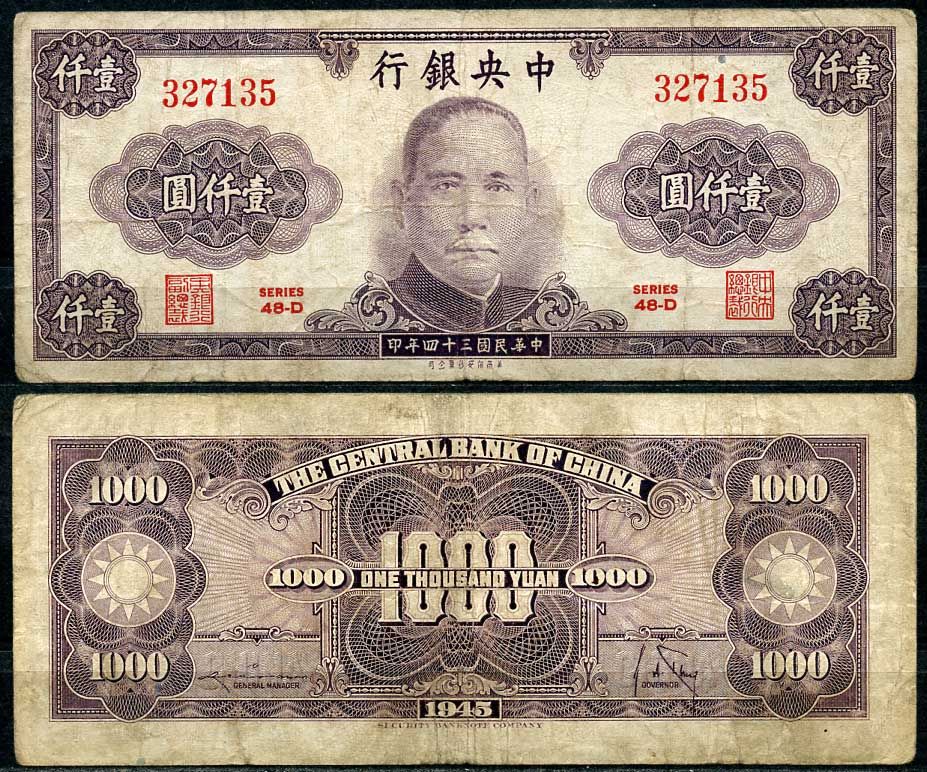 Китай 1000 юаней 1945 центральный банк, Сунь Ятсен Pick 290 бумага 7485-9-1-2