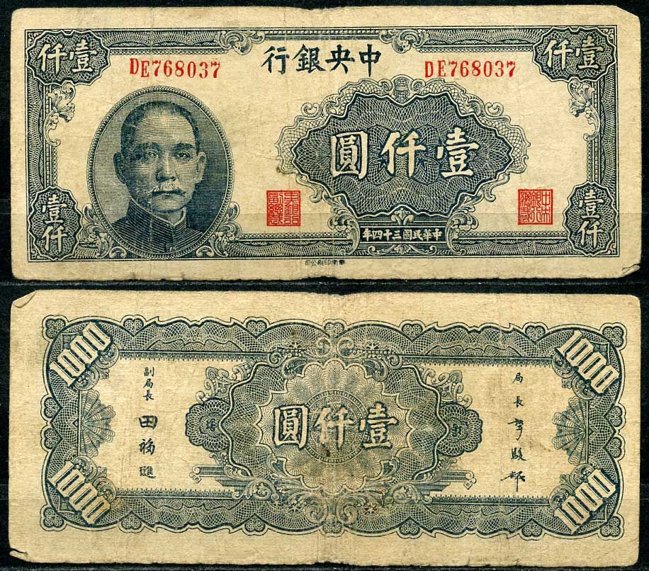Китай 1000 юаней 1945 центральный банк, Сунь Ятсен Pick 298 бумага 7485-9-3-2