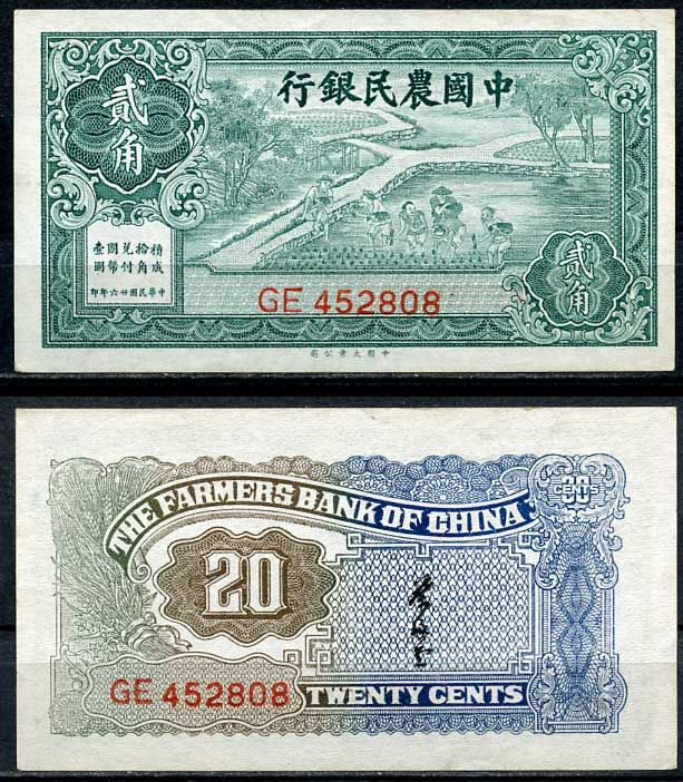 Китай 20 центов 1937 фермерский банк Pick 462 бумага aUNC 451-656-2-1