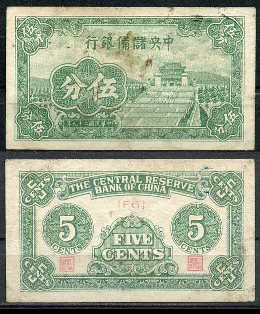 Китай 5 центов 1940 Японская оккупация, центральный резервный банк Pick J2 а бумага 8614-34-4-2