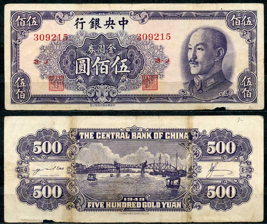 Китай 500 золотых юаней 1949 центральный банк, Чан Кайши Pick 410 бумага 8614-36-2-1