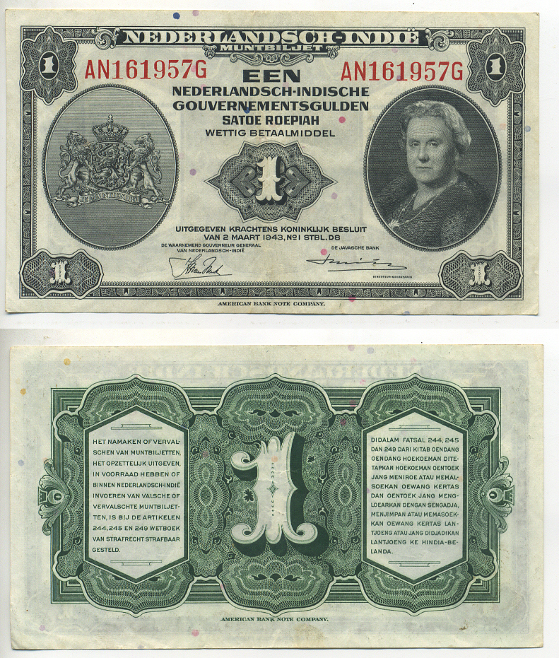 Нидерландская Индия 1 гульден 1943 Вильгельмина I (1890-1948) Pick 111 a бумага 7553-30-2