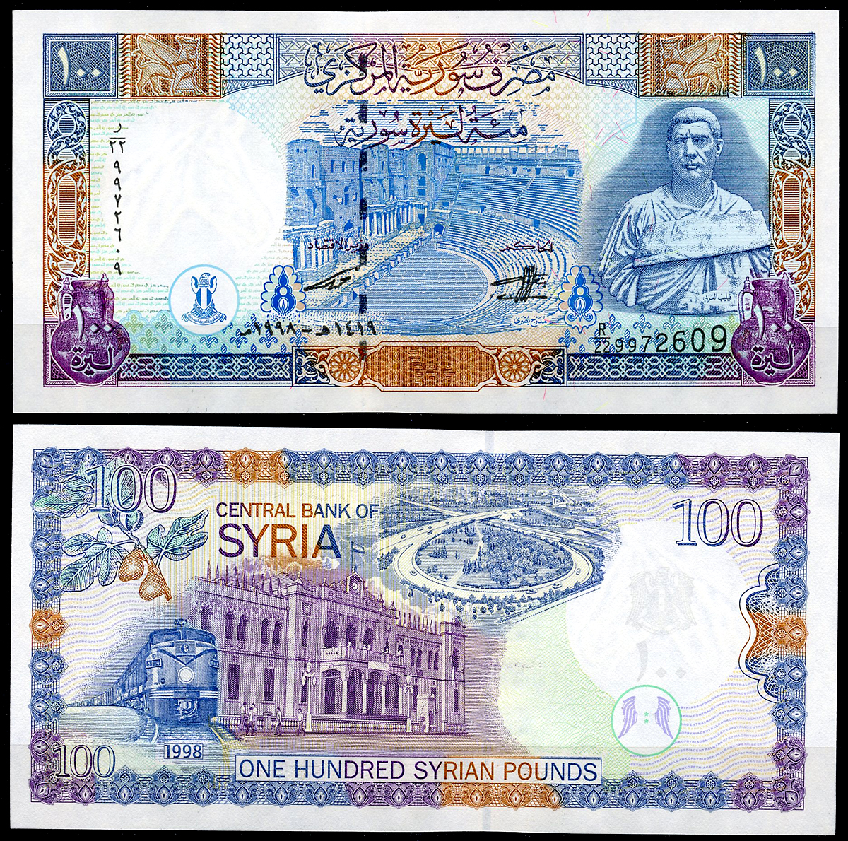 Сирия 100 фунтов 1998 театр Босра, Марк Юлий Филипп, железнодорожная станция Хиджаз Pick 108 a бумага UNC (пресс) 446-150-2