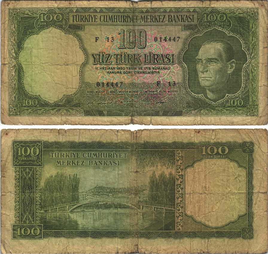ТУРЦИЯ 100 ЛИР 1964 1 ОКТЯБРЯ 1964, ПРЕЗИДЕНТ КЕМАЛЬ АТАТЮРК Pick 177а бумага VG 6289-28-1-1