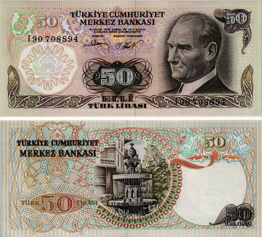 ТУРЦИЯ 50 ЛИР 1976 ПРЕЗИДЕНТ КЕМАЛЬ АТАТЮРК, МНОГОУРОВНЕВЫЙ ФОНТАН ВО ДВОРЦЕ ТОПКАПЫ Pick 188 бумага UNC (ПРЕСС) 6281-15-4-1