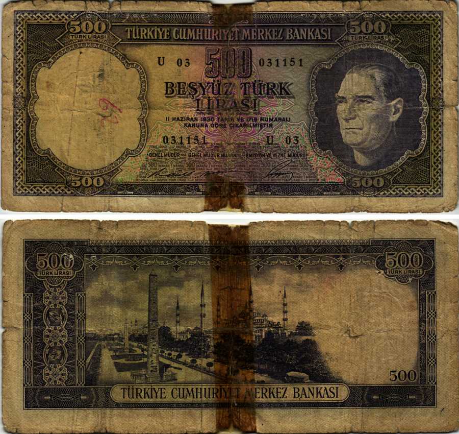 ТУРЦИЯ 500 ЛИР 1968 ПРЕЗИДЕНТ КЕМАЛЬ АТАТЮРК Pick 178a бумага G 7183-35-1-2