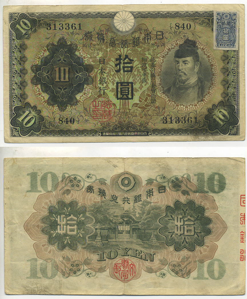 ЯПОНИЯ 10 ЙЕН 1946 МАРКА НА 10 ЙЕНАХ 1930 Pick 79a бумага 7523-5-3-1