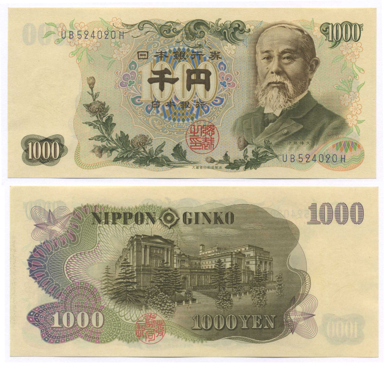 ЯПОНИЯ 1000 ЙЕН 1963 ГОЛУБАЯ СЕРИЯ Pick 96d бумага UNC (ПРЕСС) 8564-29-1-2