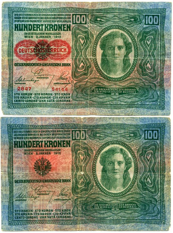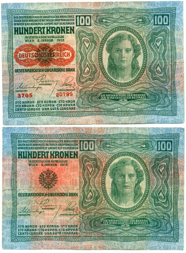 Австрия 100 крон 1912 (1919) красная надпечатка на Pick 12, на аверсе Pick 56 a бумага 444-127-1