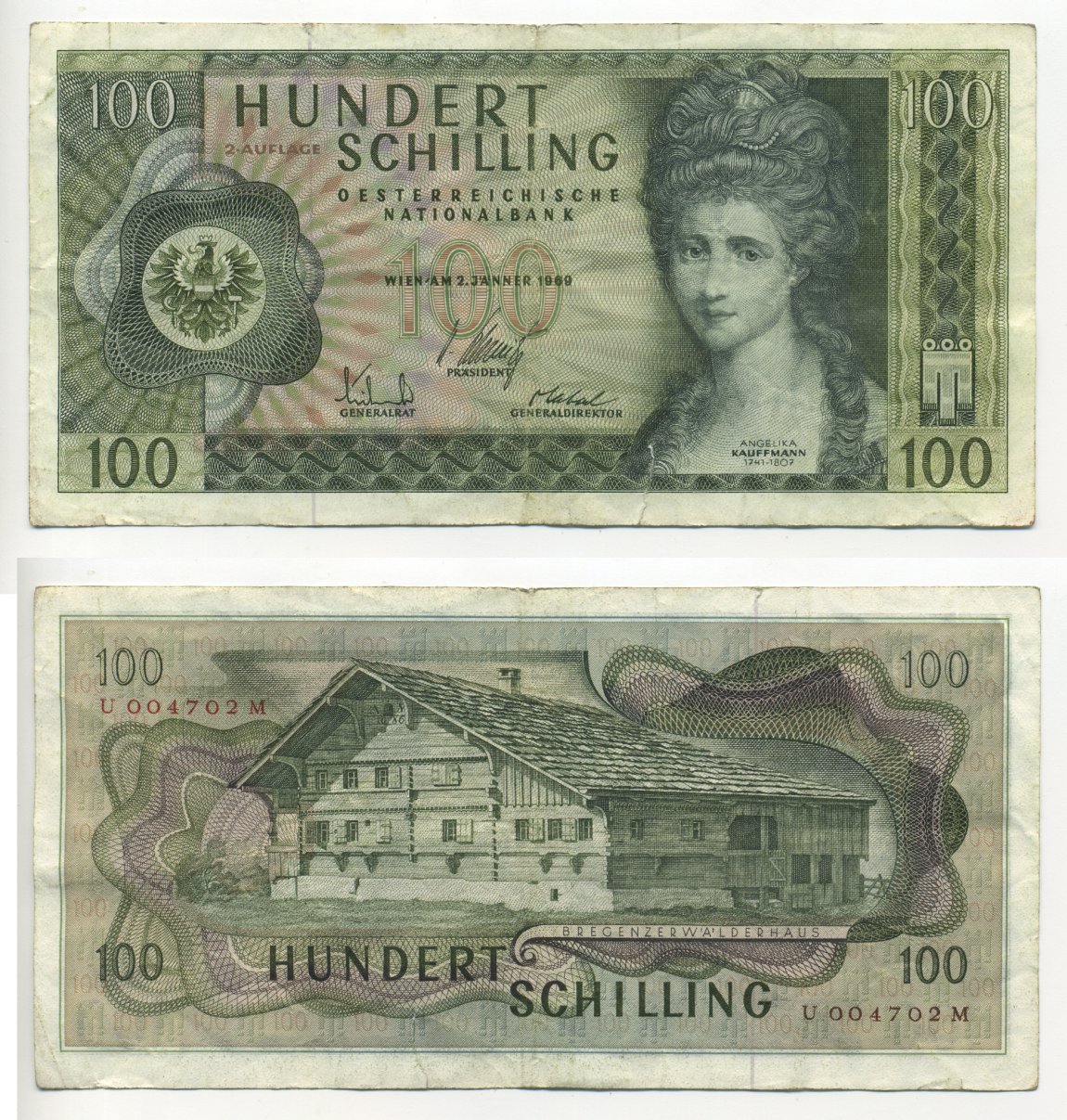 Австрия 100 шиллингов 1969 Анжелика Кауфманн, "Монфор" герб Форарльберга Pick 145a бумага 6294-2-3