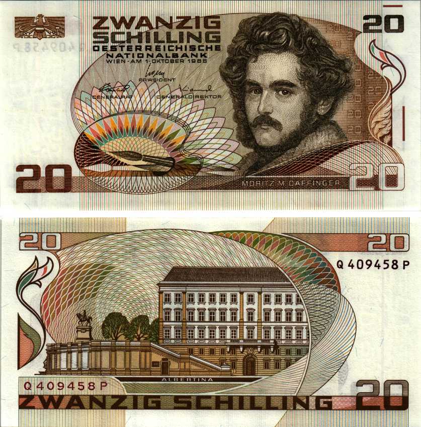 АВСТРИЯ 20 ШИЛЛИНГОВ 1986 (1988) 1 ОКТЯБРЯ 1986, МОРИЦ МИХАЭЛЬ ДАФФИНГЕР, ВЕНСКИЙ ХУДОЖЕСТВЕННЫЙ МУЗЕЙ АЛЬБЕРТИНА Pick 148 бумага UNC (ПРЕСС) 7214-46-3-1