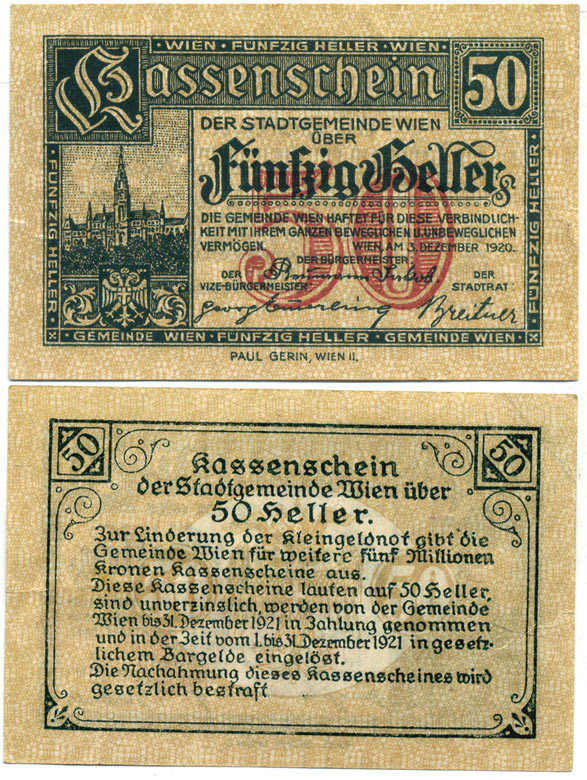Австрия, Вена 50 геллеров 1920 3 декабря 1920, нотгельд Mehl FS 1183IIbA бумага 7523-6-3-1