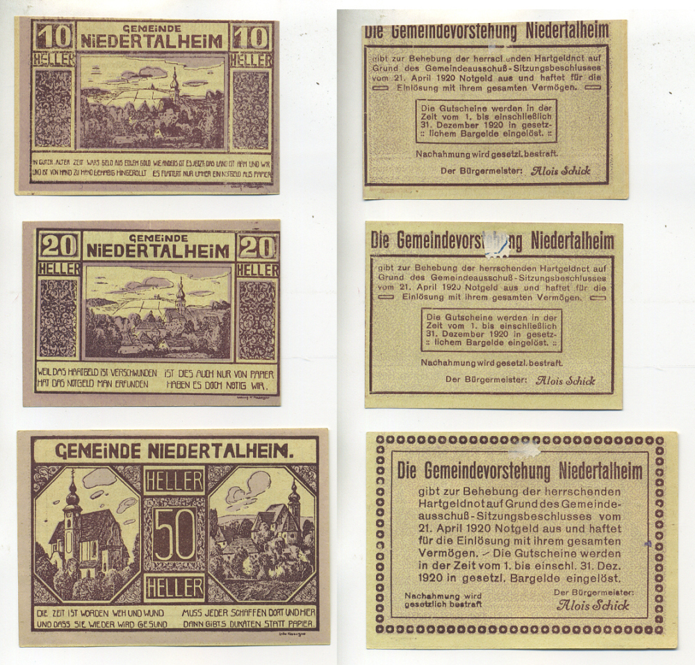 АВСТРИЯ НАБОР ИЗ 3 БАНКНОТ 1920 21 АПРЕЛЯ 1920-31 ДЕКАБРЯ 1920, НОТГЕЛЬД, 10, 20, 50 ГЕЛЛЕРОВ, NIEDERTALHEIM, ЗЕЛЕНЫЕ бумага XF 6278-21-2